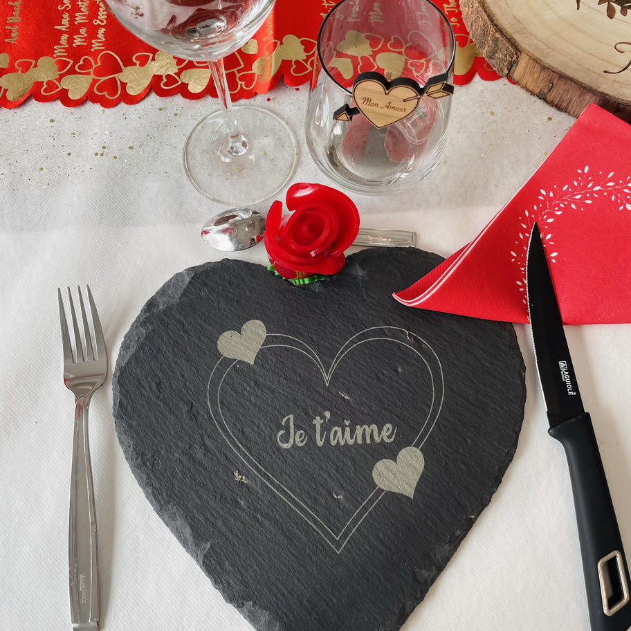 Ajoutez de l’élégance et de la tendresse à vos présentations avec notre assiette en ardoise en forme de cœur.