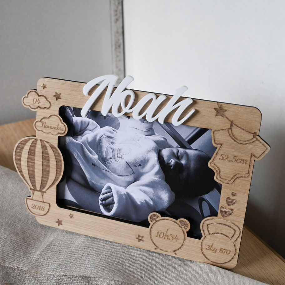 Un souvenir unique et plein d’émotion pour célébrer l’arrivée de votre bébé. Ce joli cadre en bois, finement gravé et découpé, met en valeur la première photo de votre enfant tout en rassemblant les informations essentielles de sa naissance.