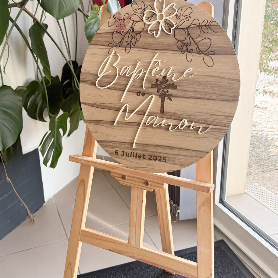 Accueillez vos invités avec élégance grâce à cette superbe pancarte en bois personnalisée. Parfaite pour un baptême, un mariage ou tout autre événement, elle met en valeur le prénom, la date et un joli décor floral gravé et découpé.
